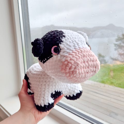 Heklet ku bamse laget i brune og beige farger. Myk tekstur med detaljer som øyne, nese og en liten blomst festet til øret. Passer som dekorasjon eller leke.