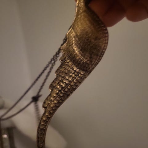 Selger et stilrent og moderne kjede i sølvfarget metall med dekorativ vingepassasje.