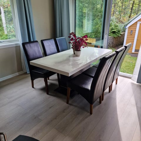 Helt nye ( "3 dager gamle" ) 8 stk spisestoler vurderes solgt pga feilkjøp. Kjøpt på salg kr 1299 pr stk hos Skeidar. Alle 8 selges under ett . Sortlakkert med brun tekstil . ( "skinnlook/PU " ) Meget bra sittekomfort. Pris satt 1299 pr stol. Må hentes.