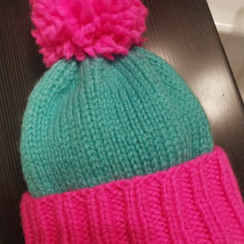 Hjemmestrikket lue i ull og silk mohair. Myk og varm. Ubrukt. Farge: grønn