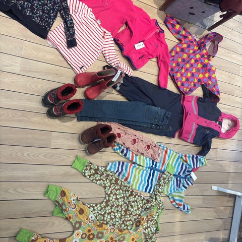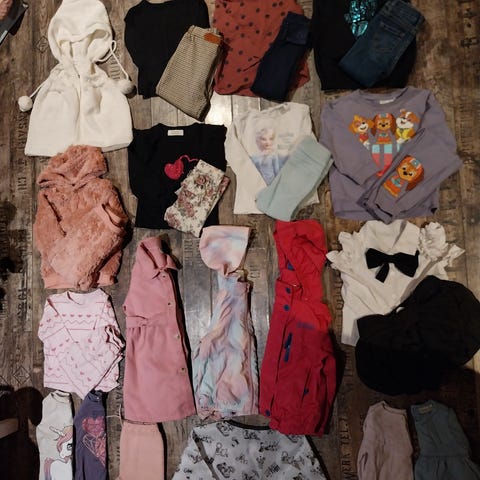 Stor klespakke pike inneholder blandt annet, og dertil flere ting som jakker, t skjorter, gensere, sommerkjoler og bukser. Det meste i størrelsene 92 til 104 (to eller tre ting i 86). Noen større størrelser kan ha sneket seg med men her er det mye for pengene og klær for lang tid.