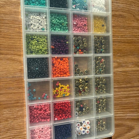 Et utvalg perler i forskjellige farger og størrelser, organisert i plastbokser. Egnet for hobby- og håndverksprosjekter som perlekunst og smykkelaging.