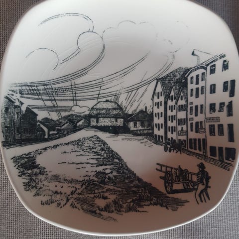 Stavangerflint dekorative fat med motiver fra Trondheim og Lillehammer. Fatene har fargerike illustrasjoner som viser bylandskap og aktiviteter, laget i keramisk materiale.