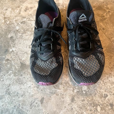 Reebok joggesko i størrelse 35.5. Jeg bruker 36 til vanlig, så de er litt store på størrelsen. Skoene har bruksmerker spesielt inni, men ser relativt nye ut utvendig. De er brukt kanskje 10-12 ganger på gåtur. Skoene har en veldig slitesterk såle med godt grep. Materialet er pustende og egnet for utendørs bruk.