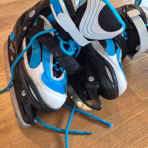 Justerbare skøyter barn. Pent brukt. De har vært slipt og skøytene er derfor ganske gode og skarpe, til forskjell fra de som kommer rett fra butikken uten slip.