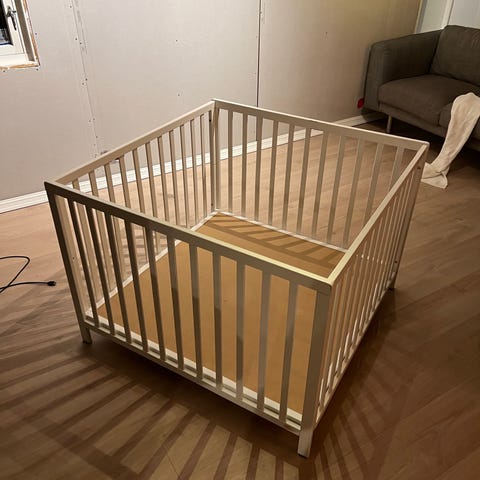 Pent brukt lekegrind. Kjøpt brukt av meg også. Medfølger matte i bunn. Litt slitt i lakken på noen plasser, men MYE bruk igjen🙂