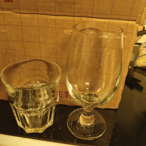 Den store grå drikkeflaske er deformert i bunn etter vi vasket den i oppvaskmaskinen.