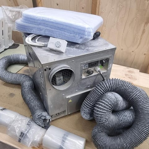 Avfukter selges, fungerer fint. Har vannbeholder, man kan koble på slange.