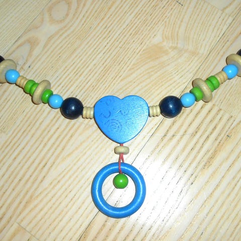 L1. TreBarnevognremse m/stort hjerte og ring og klyper (grønn/blå) Pent brukt. 100kr