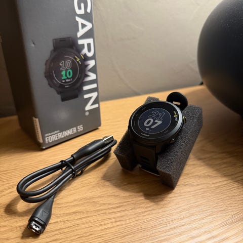 Garmin Forerunner 55 smartklokke med ladekabel. Modellen er designet for sports- og aktivitetsmåling, med funksjoner for pulsmåling og GPS-sporing.