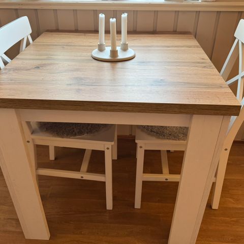 Selger 6 stoler. Setet er ikke fastmontert, så det kan enkelt løftes av og trekkes om. Det eksisterende trekket er bare stiftet på.
