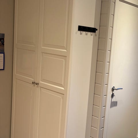 Selger et pent brukt IKEA PAX garderobeskap med smart løsning, perfekt for gang eller entré. Skapet er brukt som romdeler og gir både god oppbevaringsplass og et ryddig uttrykk.