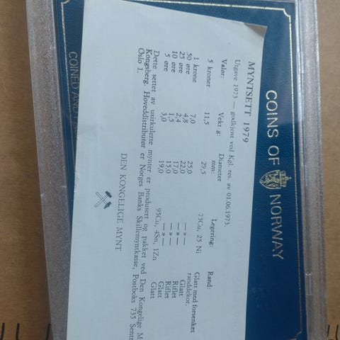Coins of Norway Myntsett fra 1975 med flere mynter i ulike valører. Myntsettet inneholder mynter i forskjellige størrelser og materialer, presentert i en beskyttende innfatning. Passer for samlere eller som dokumentasjon av norske mynter fra denne perioden. Ulempen er l-i0tt av bak dekselet har en sprekk(se bilde) senker riseno fra 1000 til 750