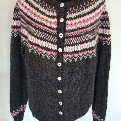 Flott håndstrikket kofte strikket med lettlopi garn - lett og fint ullgarn - mål på kofta: brystvidde 112 cm -armlengde til armhule 48 cm lengde på bol opp til armhule 30 cm og hel lengde midt foran 49 cm - aldri brukt - sendes med PostNord kr 69,- eller med fiksferdig