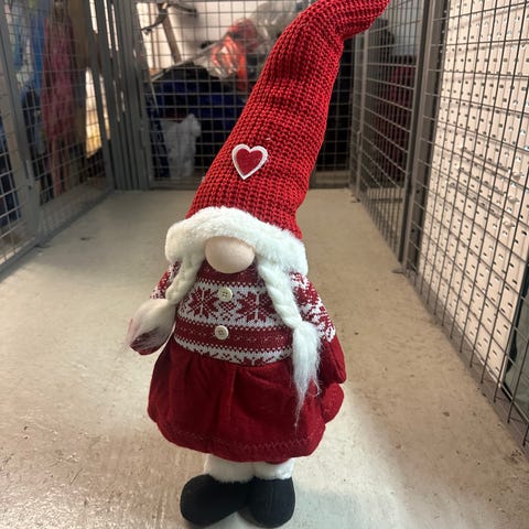 Nissefigur i rødt med hvitt skjegg som holder en trillebår i tre. Passer som dekorasjon, spesielt i julen.