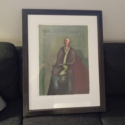 Kunstverk med motiv av en person delvis dekket av et sirkelmønster i svart og gult på rød bakgrunn. Mål: 60 cm bredde og 50 cm høyde. Ca mål. Inkluderer svart ramme og innglassing.