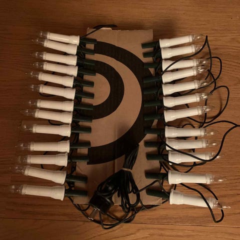 Fine retro julelys med 16 lys og klyper. Juletrelysene lyser, og det er greit å få tak i resevepærer til disse. Støpselet passer til alle stikkontakter også jordet.