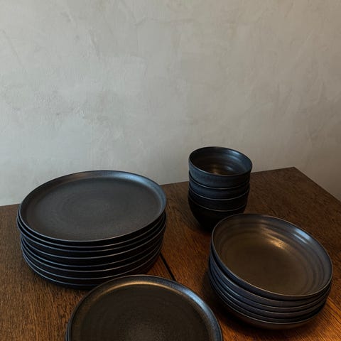 IKEA tallerken sett i svart farge. Settet inkluderer flere tallerkener i ulike størrelser. Materialet er keramikk. 1 tallerken har hakk (se bilde).