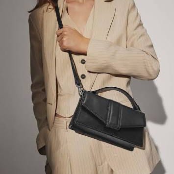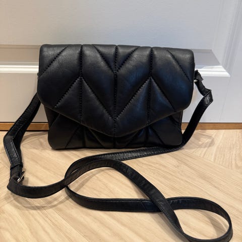 Markberg dameveske laget av andre materialer i fargene svart og beige. Vesken har en rektangulær form med to skulderstropper, en frontlomme med klaff og knapp, samt en baklomme med glidelås. Innvendig er det en glidelåslomme for oppbevaring av mindre gjenstander.