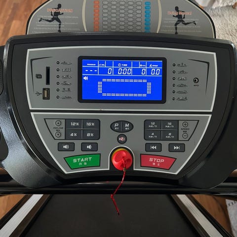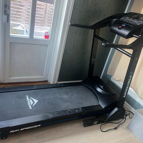 Merida Run Starter tredemølle med digitalt display og kontrollpanel. Tredemøllen har en løpeflate med svart og hvit design, og er egnet for innendørs bruk. Leveres med brukerveiledning.