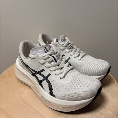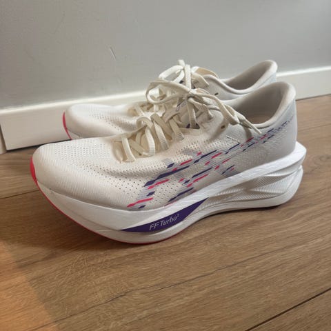 Brukt 17km totalt, 12km ute på asfalt og 5km på mølle. Supertrainer med pebax plate til variert fart og distanse med god demping og komfort.