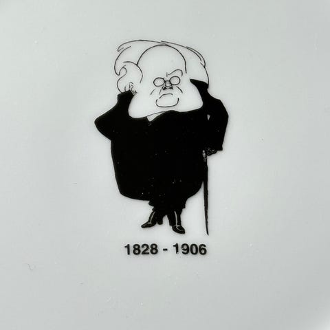 Holmegård Atlantis stor bolle i glass med blå og svart mønster på hvit bakgrunn av designer Michael Bang. Kjøpt ny i 1988 og for det meste stått til pynt.