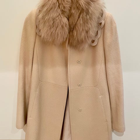 Karen Millen kåpe i beige/hvit farge, størrelse S, laget av 100% bomull. Jakken har belte og knappelukking, samt lommer og detaljer som gir funksjonalitet og stil.