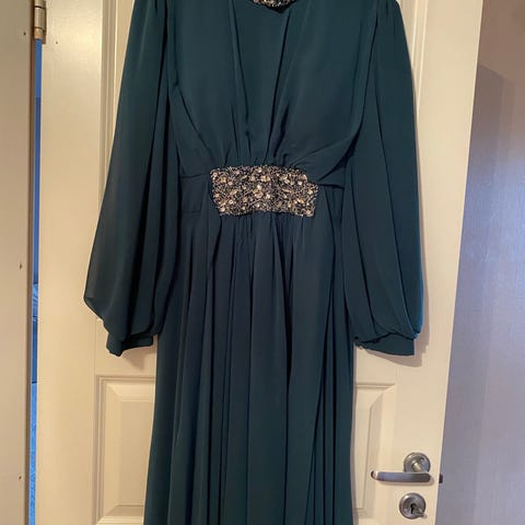 & Other Stories festkjole i rød fløyel, størrelse M. Kjolen har lang erm og en tettsittende passform som fremhever figuren. Materialet gir en myk og luksuriøs tekstur. Egnet for formelle anledninger og festbruk.