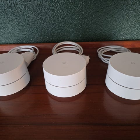 Google Nest Wifi Router i hvit farge. Produktet inkluderer strømadapter og nettverksporter for tilkobling. Designet for bruk i hjemmenettverk.