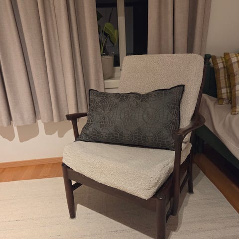 Unik og retro lenestol fra IKEA med nye sitteputer og trekk. Trekkene kan tas av og vaskes. Stolen er god å sitte i og solid.