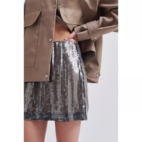 «Bashes skirt» fra Second Female er en rålekker paljett miniskjørt. Høy på livet og lukkes med glidelås bak. Normal i størrelsene.