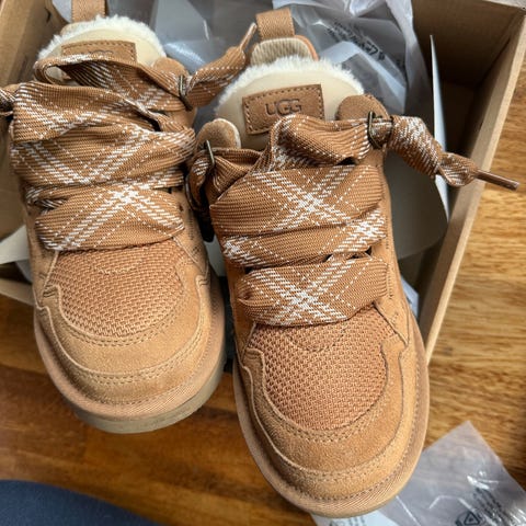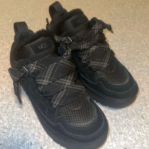 Selger helt nye UGG W Lowmel - farge sand - US str 6 (37). De er prøvd inne og vi har klippet av posen med ekstra lisser, derfor får vi ikke byttet dem. De er ikke brukt, bare prøvd på inne. Selges da de ble for små.