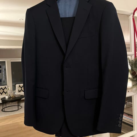 Blå dress i 3 deler. Alle størrelser på jakke, vest og bukse står med bildene.