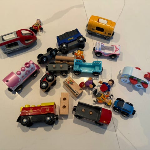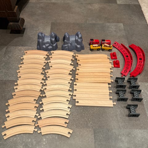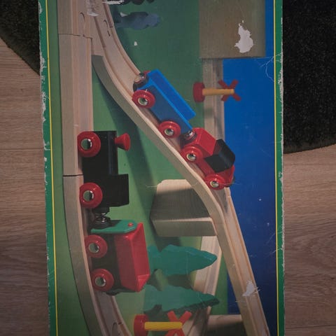 BRIO trelekesett bestående av flere tog med tilhørende skinner i tre. Settet inkluderer rette og buede skinner, kryssingsskinner, bru, ferje, tunnell og to tog med flere vogner i forskjellige farger. Passer for barn og kan brukes til konstruksjon og lek med togbaner.
