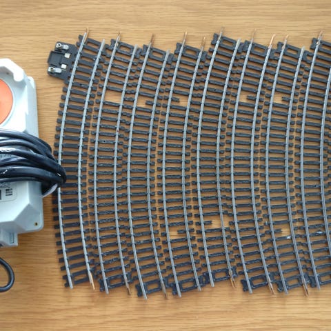 Samling av modelljernbane skinner og tilbehør i ulike former og størrelser. Inkluderer rette, buede og kryssende skinner, samt koblinger og elektriske komponenter for modelljernbane. Passer for hobbybruk og modelljernbaneoppsett.