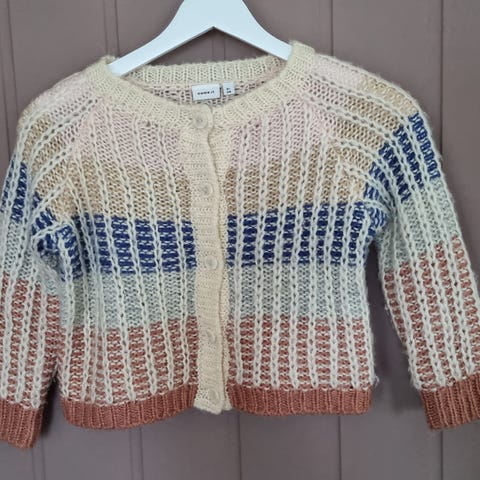 Pent brukt cardigan fra Young dimensions, str 4-5 år, 110. Hvit farge med hjerter i hullmønster og glitter-knapper.