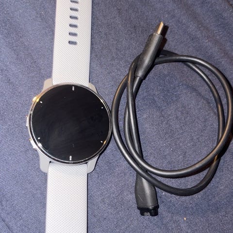 Garmin Venu 2 Plus smartklokke i hvit farge. Klokken har rund urskive og silikonrem. Den er utstyrt med flere helse- og treningsfunksjoner og passer for daglig bruk.