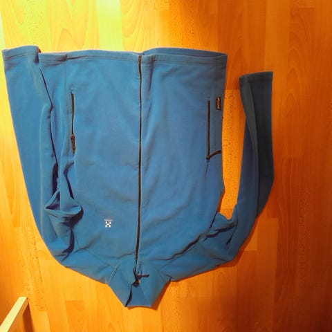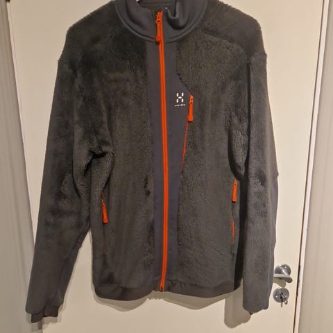 Haglöfs fleecejakke for menn i størrelse M. Jakken er svart og laget av fleece-materiale. Den har hette og glidelås foran, egnet for ulike aktiviteter innen sportstypen Annet.