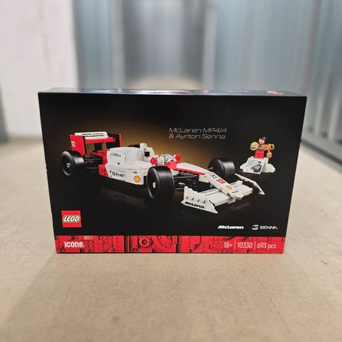 LEGO Icons McLaren MP4/4 & Ayrton Senna byggesett med 693 deler. Sett inkluderer detaljerte modeller av McLaren MP4/4 Formel 1-bil og figur av Ayrton Senna. Passer for voksne byggere, alder 18+.