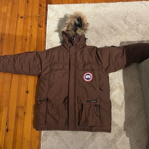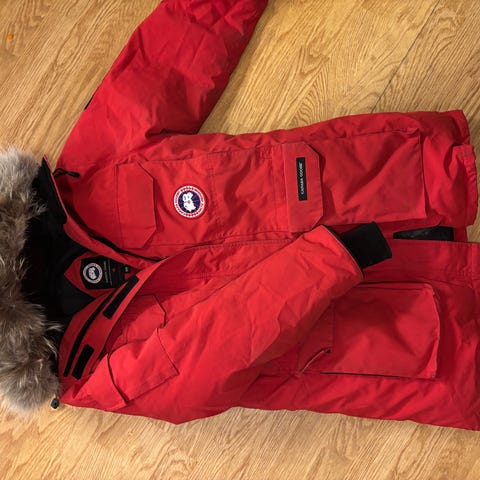Canada Goose Expedition vinterjakke i størrelse M. Jakken er designet for å gi varme og beskyttelse i kalde værforhold, med isolerende materiale og hette med pelskant. Egnet for utendørs bruk om vinteren.