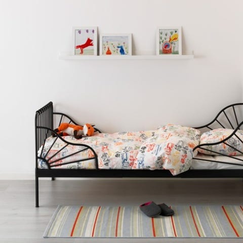 Bohus enkeltseng for barn, kjøpt ny i 2020. Sengen har en enkel design med trelameller som gir støtte for madrass. Fargen på sengen er blågrå, og den er laget av malt tre. Enkeltsengen passer for barn og har noen bruksmerker på overflaten. Sengehest følger med i samme farge.