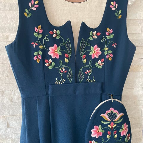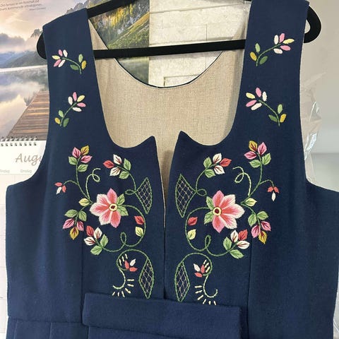 Sydd i et luftigere stoff enn andre bunader, antatt ull, med broderier i ull. Se nærbilder for å se stofftype og broderi.
