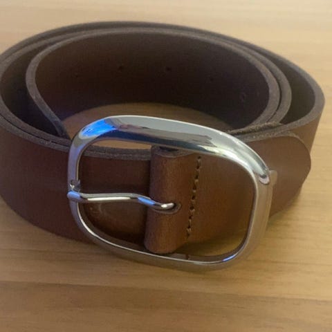Selger et feilkjøpt herrebelte i brun farge. Beltet er laget av 100 % ekte lær (står i alle fall det) og har en pinne-spenne. Passer for litt runde menn og egnet til formelle og uformelle anledninger.