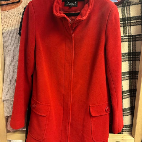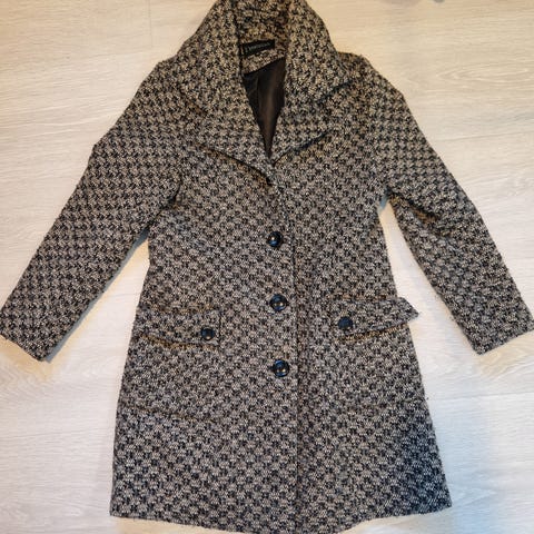 Svart L'evolution kåpe med veldig fint snitt. Fin og kledelig krave. Kvaliteten er 65% ull og 35 % viscose .En lett og behagelig kåpe som nesten er ubrukt .