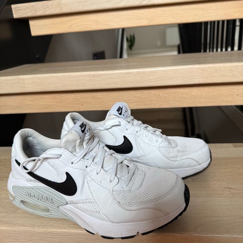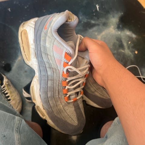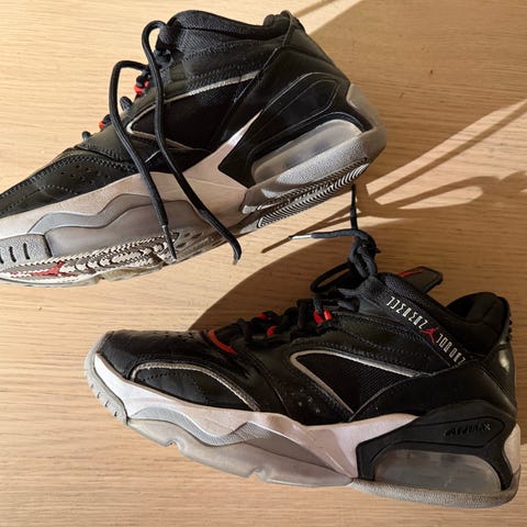 Skoene er godt brukt, mangler såler og hull under den ene skoen. Samt creased som er standard på disse skoene. Skoene selges som dem er for 200 kr.