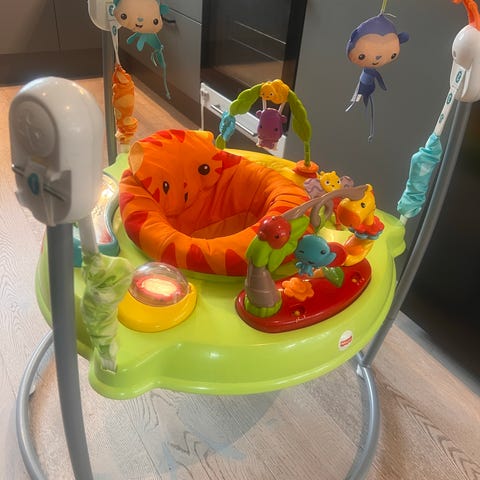 Selger et Fisher-Price Rainforest Jumperoo i god stand. Veldig populært og morsomt babygym/babybøyle som gir mye glede og aktivitet for de minste.