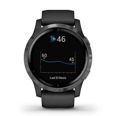 Garmin Vivoactive 4 og 4S (herre og damemodell) smartklokke med svart urskive. På herremodell er orginal reimen byttet til en skinnreim for mer luksuriøst uttrykk til hverdags. Finner ikke originalen.