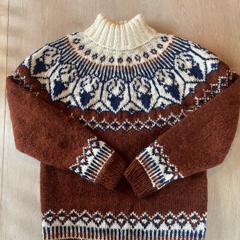 Nydelig håndstrikket Islandsgenser/ villmarksgenser. Strikket av en meget dyktig strikker. Skulle beholdt den, men synes den er blitt litt vid.. en liten maske kan det se ut som er litt løsere enn skal, men uten betydning. Mål kan sendes ved behov. Selv er jeg 185. Ønskes fler bilder med den på så er det bare å ta kontakt.