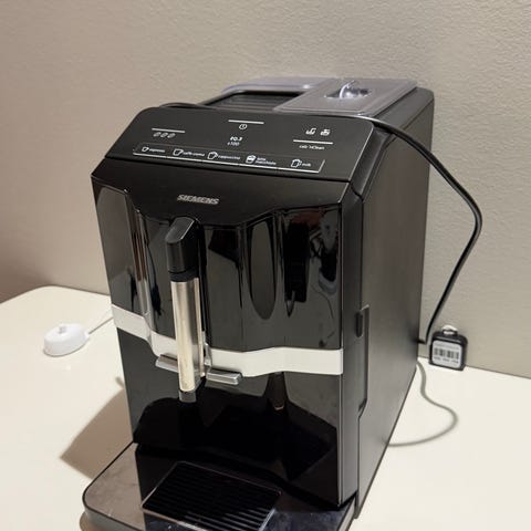 Electrolux EEA210 espressomaskin i fargen stål. Maskinen har en kompakt størrelse og inkluderer steamfunksjon for melkeskumming.