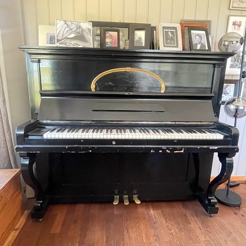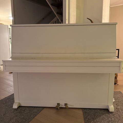 L. Schmidt upright piano med trefinish. Pianoet har standard tangenter og pedaler, og en klassisk design som passer til ulike rom. Litt slitt i lakken.